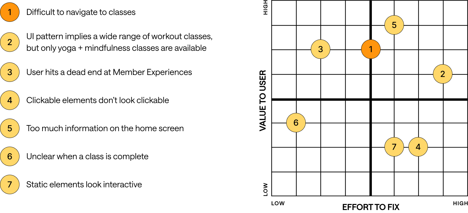 We mapped these issues using a design prioritization matrix (value to user vs. effort to fix). Our focus centered on high-impact, low-to-medium effort improvements that eliminate confusion and remove dead ends in the movement journey.